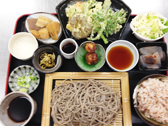 お蕎麦と天ぷらにさらに沢山の小鉢と雑穀ご飯のついた欲張りセット。全ての味を楽しみたい方に是非!