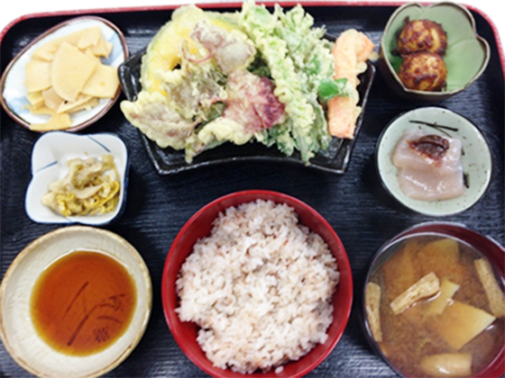 雑穀ご飯とお味噌汁、天ぷらに小鉢がついたさいはらの味を楽しめるセット。